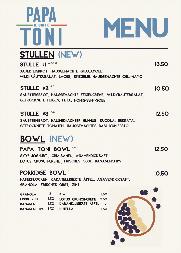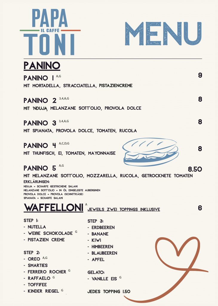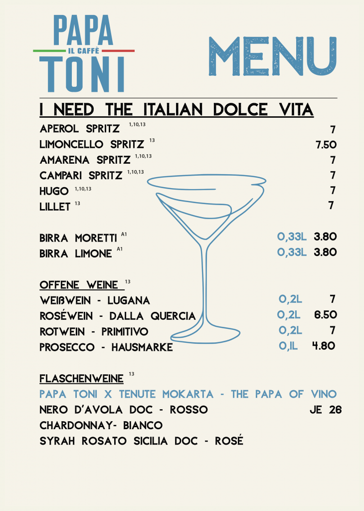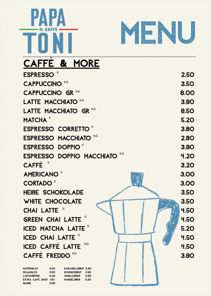In unserem Café servieren wir nicht nur den vollmundigsten Kaffee, sondern auch Frühstückskreationen, die Ihren Morgen beleben. Und wenn die Mittagssonne strahlt, erwarten Sie deliziöse italienische Gerichte, die Ihr Herz höher schlagen lassen. Von Espresso bis Limonaden – bei uns schmeckt jeder Moment nach Dolce Vita. Ihr italienisches Zuhause erwartet Sie!